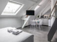 A furnished space of approximately 25 m2 (270 sq. ft.) including an entryway, kitchenette, bathroom with towels for 4 people and living room.