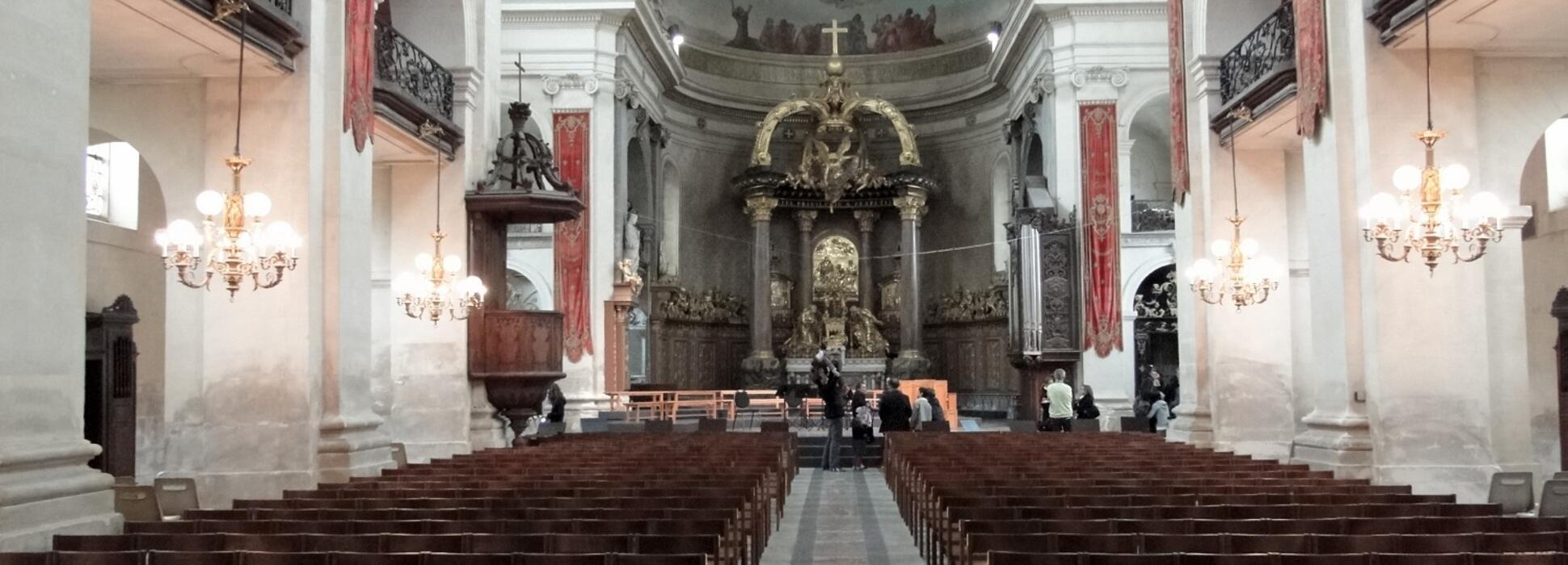 En centre-ville de Caen près de la place de la République, Notre-Dame de la Gloriette est une église baroque bâtie par les Jésuites au XVIIè siècle. Quand l'ordre religieux disparut en 1762, elle fut mise en location et servit de nouveau au culte après la révolution. Bâtie selon un plan en croix latine, sa façade est inspirée de l'église du Gesù de Rome. Elle comprend le mobilier religieux le plus riche de toutes les églises de Caen. Place du parvis Notre-Dame, Caen.