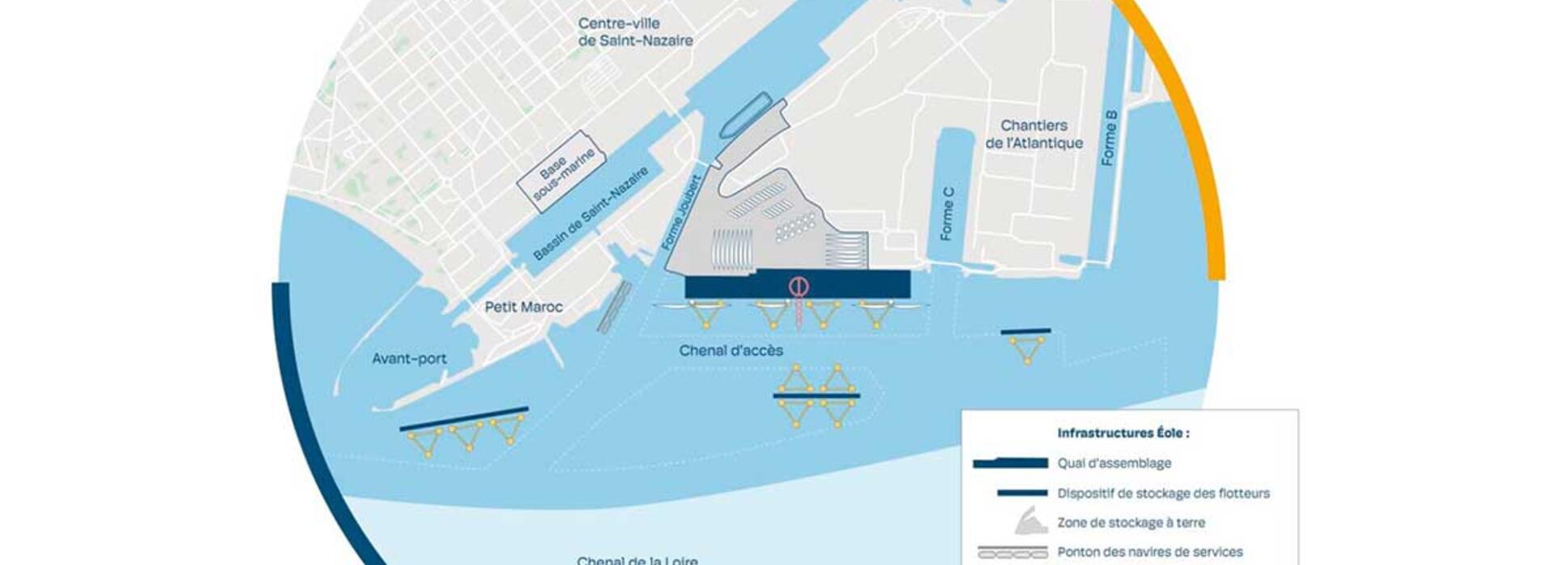 La plateforme offshore comprendra plusieurs infrastructures. Un quai de 780 mètres facilitera l’assemblage des éoliennes flottantes. Sur terre comme sur plan d’eau, des zones de stockage sont prévues pour concevoir les pales, sections de mâts, nacelles, turbines, outillages et éléments de grues et assurer le stationnement de huit flotteurs d’éoliennes nus en attente d’assemblage. Enfin un ponton accueillera des remorqueurs chargés du convoyage des éoliennes flottantes et les éventuels navires d’exploitation.