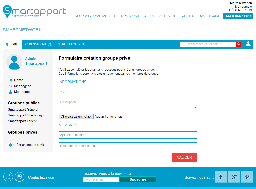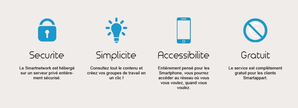 Les établissements du groupe Smartappart proposent à tous leurs clients de nombreux services en ligne uniques dont le Smartnetwork : un réseau social privé pour s'informer et échanger. Que vous logiez dans un de nos établissements pendant vos vacances ou lors d'un déplacement professionel en équipe, ou que vous soyez l'un de nos partenaires locaux, le Smartnetwork vous permettra au choix de faciliter vos séjours, d'organiser le travail avec vos collaborateurs, de proposer des services de qualités autour de nos sites ou tout simplement d'informer ou d'être informé sur l'actualité locale.