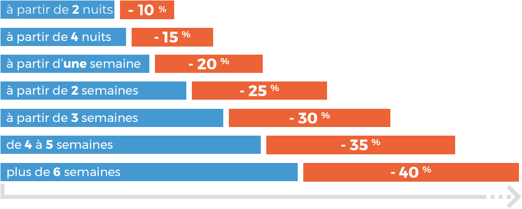 Nos tarifs sont dégressifs de 10 % à 40 % pour des séjours de 2 nuits jusqu’à 6 semaines et plus
